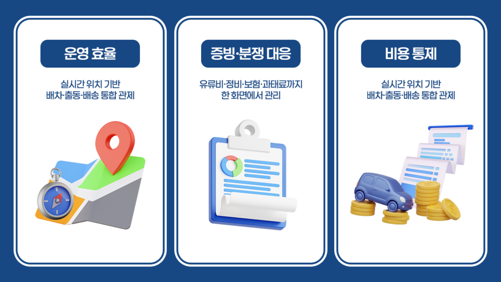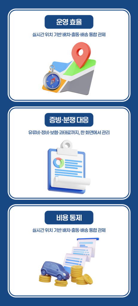 이는 차량 운영을 사후 정산 중심의 관리 방식에서 운영 중 통제·기록·증빙이 동시에 이루어지는 체계적 관리 구조로 전환시키는 핵심 요소입니다.