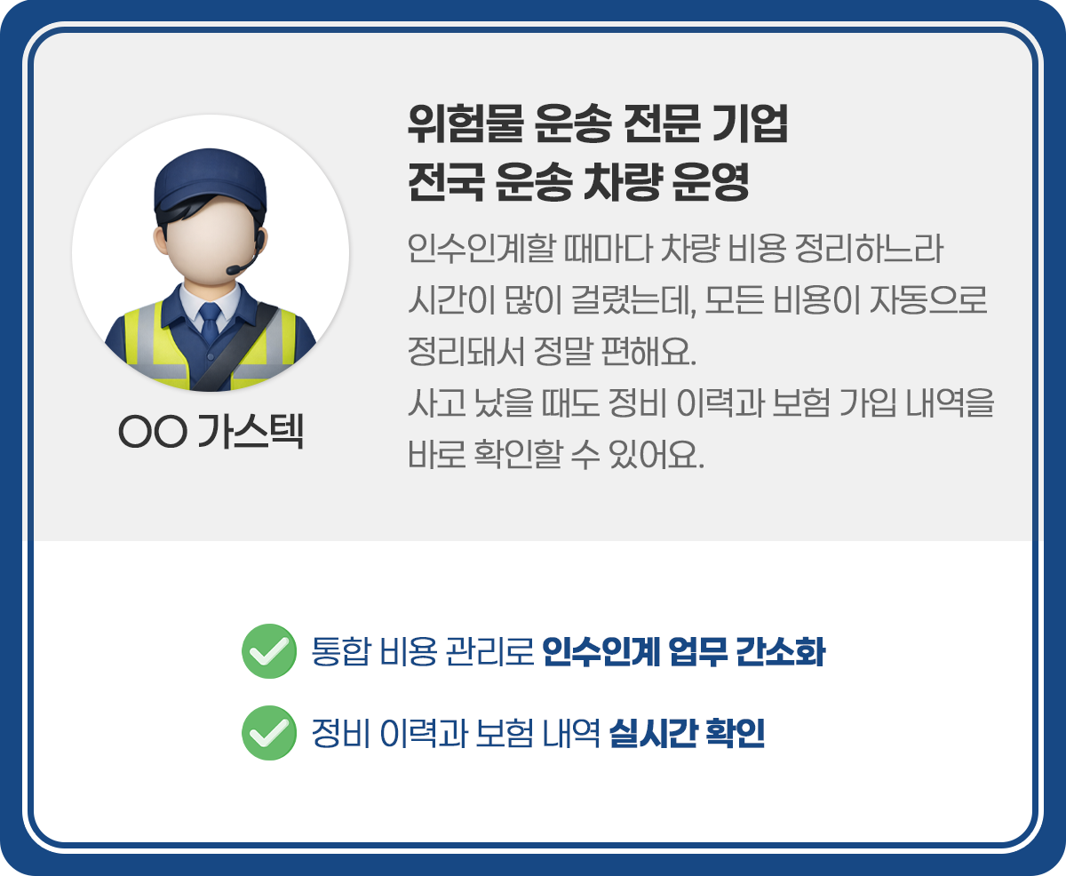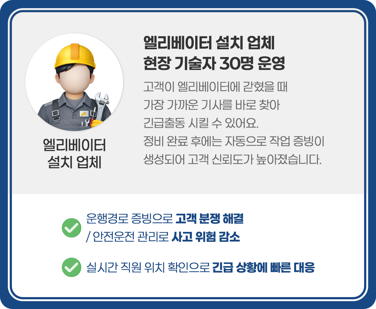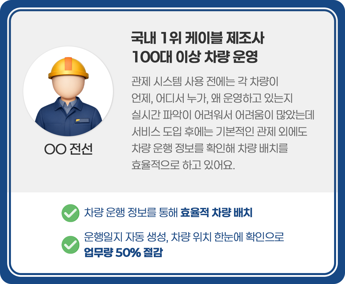 이를 통해 출동, 배송, 통근·통학, 공공 서비스, 폐기물 수거 등 차량이 곧 서비스 품질로 연결되는 환경에서 업무 신뢰도·비용 통제·법규 대응을 동시에 만족하는 운영 체계 구축이 가능합니다.