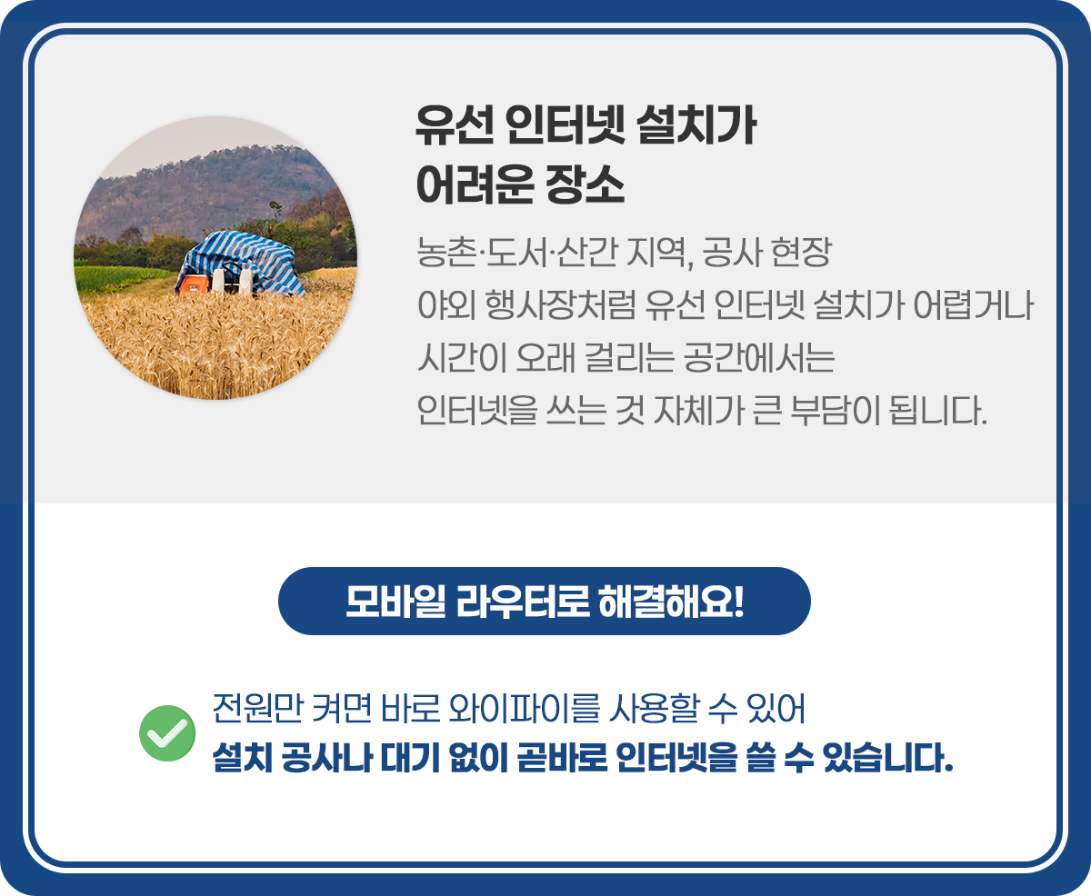 설치가 어려운 장소, 이동이 잦은 업무 환경, 불안정한 무선 환경에서는 기존의 유선 인터넷이나 휴대폰 핫스팟만으로는 한계가 분명하지만, 모바일 라우터를 통해 설치나 장소 제약 없이 즉시 인터넷 환경을 확보할 수 있습니다.