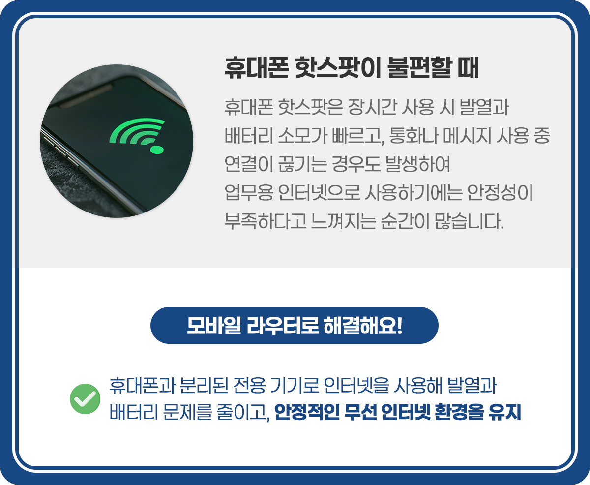 발열, 배터리 소모, 끊김 없이 휴대폰과 분리된 전용 기기로 안정적인 무선 인터넷을 사용할 수 있어요.