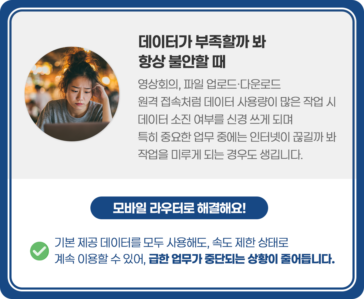 매번 다른 와이파이 환경에 맞춰 설정하거나, 연결 불안정으로 업무 흐름이 끊기던 상황을 줄여주며, 인터넷 환경 때문에 업무 장소를 옮겨야 하는 불편함을 최소화합니다.