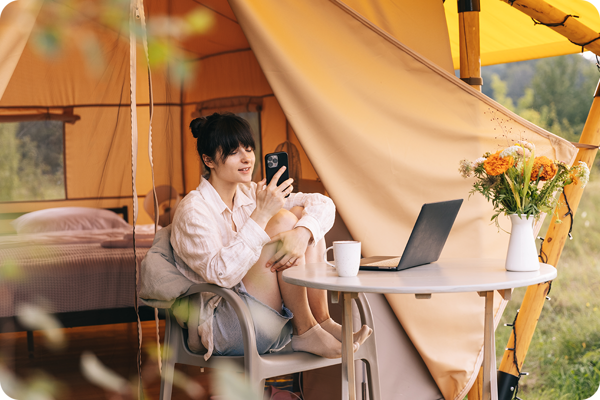 캠핑장이나 캠핑카, 이동 중에도 모바일 라우터로 여러 기기를 연결해 영상 시청, 인터넷 검색, 콘텐츠 이용을 편리하게 즐길 수 있습니다.