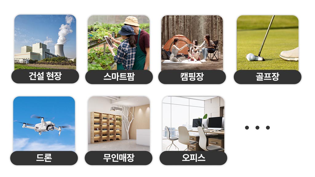 5G 라우터는 건설 현장, 스마트팜, 캠핑장, 골프장, 드론, 무인매장, 오피스 등 다양한 장소에서 활용할 수 있습니다.