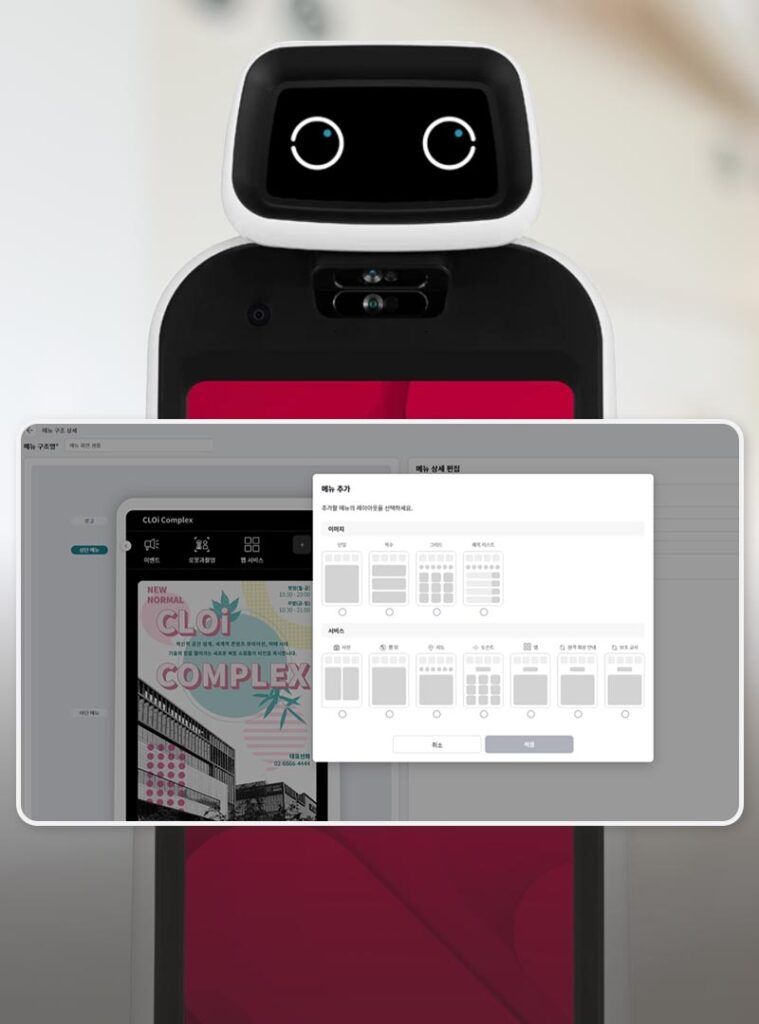 클로이 안내로봇은 전용 CMS(Content Management System)를 통해 콘텐츠와 운영 방식을 관리합니다. 메뉴 구성 편집, 사이니지 콘텐츠 변경, 운영 스케줄 설정 등을 관리자 화면에서 처리할 수 있어, 로봇을 직접 조작하지 않아도 운영 내용을 손쉽게 업데이트할 수 있습니다.